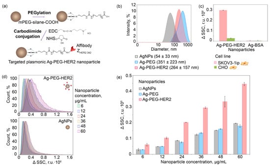 Nanoparticle conjugation to HER2-recognizing scaffold protein ZHER2:342 and HER2-overexpressing cell targeting in in vitro tests. (a): The schematic illustration of NP surface coating with artificial scaffold polypeptide—affibody ZHER2:342 through the intermediate PEGylation and subsequent carbodiimide conjugation. (b): DLS distributions showing the dependence of the intensity (%) of pristine (Ag NPs), PEGylated (Ag-PEG), and affibody-decorated (Ag-PEG-HER2) silver nanoparticles on their hydrodynamic diameter (nm). (c): Flow cytometry side scatter change ΔSSC of SKOV3-1ip and CHO cell populations labeled with targeted Ag-PEG-HER2 and nontargeted Ag-BSA nanoparticles (r.u.·105). (d): Flow cytometry histograms in SSC channel of SKOV3-1ip cells labeled with different concentrations of Ag NPs (top) and Ag-PEG-HER2 (bottom) nanoparticles. (e) The dependence of ΔSSC (r.u.·103) on SKOV3-1ip cell populations labeled with different concentrations of Ag-PEG-HER2, Ag-PEG, and Ag (µg/mL) obtained with the flow cytometry. ΔSSC was calculated as raw SSC intensity with subtracted SSC intensity of unstained cell samples.