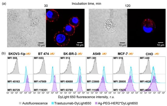 To determine Trastazumab-DyLight650 and Ag-PEG-HER2*DyLight650, SKOV3-1ip, BT 474, SK-BR-3, A549, MCF-7, and CHO cell-binding efficiency, cells were labeled with Trastazumab-DyLight650 at 2 µg/mL and Ag-PEG-HER2*DyLight650 at 4 µg/mL, washed, and analyzed using Accuri C6 (BD) flow cytometer in FL4 channel (excitation laser 640 nm and emission filter 675/25 nm).
