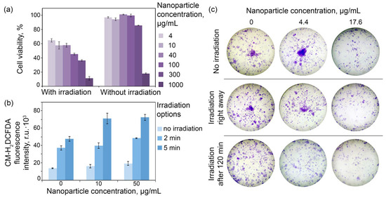 Since the MTT assay results sometimes do not reflect the cytotoxicity of compounds in terms of in vivo toxicity, we performed an additional test—clonogenic assay—reflecting the proliferative activity of cells and their ability to form a colony from a single cell. The clonogenic assay results demonstrate a decrease in the SKOV3-1ip cells′ proliferative activity after exposure to targeted nanoparticles under light irradiation (Figure 6c). The average number of cell colonies decreased with an increase in the Ag-PEG-HER2 concentration in the cell culture medium. The highest tested concentration of NPs (17.6 μg/mL) had the greatest cytotoxic effect: the number of colonies was 2.4 times smaller for cells without irradiation compared to the control sample (without NPs and without irradiation), 2.8 times smaller when cells were irradiated immediately, and 3.4 times smaller when cells were irradiated after 120 min after the incubation with nanoparticles (Figure S2).