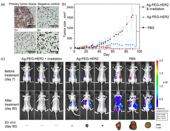 - Study of nanoparticle–cell interaction, cytotoxic properties in vitro, and antitumor activity in vivo. First, the processes of interaction of NPs with HER2-overexpressing cancer cells were studied, namely the NP internalization rate and the cytotoxic properties. Next, the light-induced hyperthermia of cancer cells in vitro was demonstrated. Last, the anticancer activity of NPs in vivo using the xenograft HER2-overexpressing tumors was studied. Cancer remission was shown when mice were treated with injections of targeted Ag NPs followed by light irradiation.