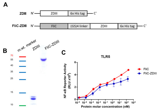 Expression and characterization of ZDIII and FliC-ZDIII recombinant proteins. (A) ZDIII and FliC-ZDIII, which were linked by a (GS)4 linker sequence (GSGSGSGS), were constructed into the pET-22b (+) vector with a C-terminal His-tag for recombinant protein expression. (B) ZDIII and FliC-ZDIII recombinant proteins produced by E. coli and purified using nickel-chelated affinity chromatography. Purified proteins were verified by SDS-PAGE staining with Coomassie blue. The molecular weight marker is indicated as the color ladder. (C) TLR5 signal functional assay was performed by co-culturing the 10-fold serial dilutions of FliC and FliC-ZDIII recombinant proteins with HEK 293A expressing TLR5 receptor and NF-κB reporter vector. The cells were disrupted and treated with neolite luciferase substrate. The TLR5 activity was measured by luciferase activity.