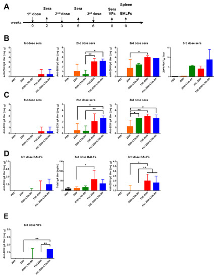 Mucosal vaccination not only triggers the systemic immune responses, such as presence of neutralizing antibodies in sera, but also induces the mucosal immune responses (i.e., presence of secretory IgA) in mucosal fluids. BALFs and VFs were collected after third dose immunizations and analyzed for ZDIII-specific IgA titers using ELISA. The results indicated that intranasal immunization with FliC-ZDIII + LTIIb-B5 elicited approximately 1.5-log IgA titers in BALFs (Figure 2D) and 1.5-to 2.0-log IgA titers in VFs (Figure 2E). To further confirm the production secretory IgA in mucosal fluids, we measured the overall total IgA titers. Our results indicated that the differences in the amount of overall IgA titer was significant for the FliC-ZDIII and FliC-ZDIII + LTIIb-B5 immunized groups (Figure 2D). Immunizations with FliC-ZDIII and FliC-ZDIII + LTIIb-B5 had higher titers of ZDIII-specific IgG antibodies in BALFs than other groups (Figure 2D). The FliC-ZDIII + LTIIb-B5 immunized group was able to elicit ZDIII-specific IgA antibodies in VFs in mice (Figure 2E).
