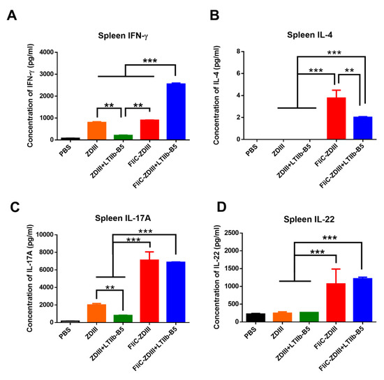 To measure T cell responses elicited by intranasal immunizations, the spleens were collected three weeks after the third-dose immunization, seeded in 24-well plates, and then incubated with recombinant ZDIII proteins for stimulation for 72 h. The culture supernatants were collected and measured for IFN-γ, IL-4, IL17A, and IL-22 production using ELISA. The results indicated that the level of IFN-γ cytokine production in the spleen of the FliC-ZDIII + LTIIb-B5 group was significantly higher than those in the ZDIII, ZDIII + LTIIb-B5, and FliC-ZDIII, groups (Figure 3A). However, the FliC-ZDIII and FliC-ZDIII + LTIIb-B5 immunized groups showed an increased but still relatively low level of IL-4 production, and no detectable levels were found for the ZDIII and ZDIII + LTIIb-B5 groups (Figure 3B). For IL-17A and IL-22 production, we found that FliC-ZDIII and FliC-ZDIII + LTIIb-B5 had significant titers in the spleen compared to all other immunized groups (Figure 3C,D). Therefore, intranasal immunization with FliC-ZDIII fusion protein induced potent Th1 and Th17 responses.