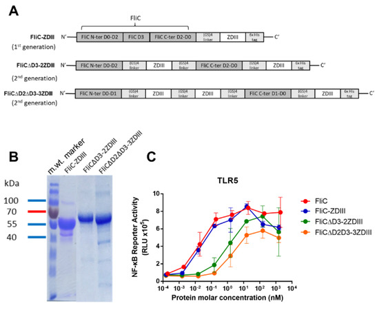 We further constructed the second-generation FliC-ZDIII fusion proteins by replacing FliC D3 with another ZDIII (FliCΔD3-2ZDIII) or replacing FliC D2 and D3 with two repeats (2x) of ZDIII (FliCΔD2ΔD3-3ZDIII) (Figure 5A), as compared to FliC-ZDIII as the first generation antigen. All these fusion proteins were expressed in E. coli BL21 and purified using nickel-chelated affinity chromatography. The purified recombinant proteins were eluted and examined using SDS-PAGE gels, all showing single major bands for FliC-ZDIII (m. wt. = 64 kDa), FliCΔD3-2ZDIII (m. wt. = 67 kDa), and FliCΔD2ΔD3-3ZDIII (m. wt. = 66 kDa) in SDS-PAGE gels stained with Commassie blue (Figure 5B). Both FliCΔD3-2ZDIII and FliCΔD2ΔD3-3ZDIII proteins were found to have lowered the dose–response curves for TLR5 activity, and the peak values for the FliCΔD2ΔD3-3ZDIII protein were significantly lower than other groups (Figure 5C).