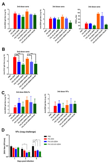 The same immunization regimen was conducted for these two second-generation antigens, 40 μg FliCΔD3-2ZDIII and FliCΔD2ΔD3-3ZDIII without or with 3 μg LTIIb-B5 adjuvant. The results indicated that the anti-ZDIII IgG titers in the sera for the FliCΔD3-2ZDIII and FliCΔD2ΔD3-3ZDIII groups without or with LTIIb-B5 adjuvant were reduced (not statistically significant) compared the FliC-ZDIII immunized groups (Figure 6A). The anti-ZDIII IgA titers in sera had almost the same titers for all immunized groups except for FliCΔD2ΔD3-3ZDIII + LTIIb-B5 (Figure 6A). For serum neutralizing antibodies, we found that the PRNT50 titer of the FliCΔD2ΔD3-3ZDIII + LTIIb-B5 group was reduced compared to the FliC-ZDIII and FliCΔD3-2ZDIII groups with LTIIb-B5 adjuvant (Figure 6A). Even without the use of LTIIb-B5 adjuvant, the PRNT50 titer of the FliCΔD2ΔD3-3ZDIII group was lower than that of the FliC-ZDIII + LTIIb-B5 and FliCΔD3-2ZDIII + LTIIb-B5 groups (Figure 6A). We also determined the anti-FliC antibodies in the sera after three-dose intranasal immunizations, and all the results followed the order of FliC-ZDIII > FliCΔD3-2ZDIII > FliCΔD2ΔD3-3ZDIII with or without the use of LTIIb-B5 adjuvant (Figure 6B). For mucosal IgA production, we measured the anti-ZDIII IgA titers in BALFs and VFs. Results from all FliC-ZDIII, FliCΔD3-2ZDIII and FliCΔD2ΔD3-3ZDIII immunized groups without or with LTIIb-B5 adjuvant showed no significant differences in IgA titers in VFs (Figure 6C). In BALFs, the anti-ZDIII IgA titers of the three antigens with the use of LTIIb-B5 adjuvant were slightly higher than the titers without LTIIb-B5 adjuvant but no significant differences were observed among FliC-ZDIII, FliCΔD3-2ZDIII and FliCΔD2ΔD3-3ZDIII antigens (Figure 6C). The immunized mice were further intravaginal challenged with ZIKV, and the results showed that the virus titers in VFs on days 1, 3 and 5 were significantly lower for the FliC-ZDIII, FliCΔD3-2ZDIII, and FliCΔD2ΔD3-3ZDIII groups than the PBS control group (Figure 6D). Therefore, the second-generation FliCΔD3-2ZDIII and FliCΔD2ΔD3-3ZDIII antigens resulted in a reduced titer of anti-FliC IgG antibodies in sera but still retained the same titers of serum IgG, IgA, and neutralizing and mucosal IgA antibodies and protective immunity