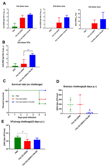 We further used LTIIb-B5 adjuvant formulated with the second-generation FliCΔD3-2ZDIII fusion protein to enhance mucosal immunity. Three immunized groups (PBS, FliCΔD3-2ZDIII, and FliCΔD3-2ZDIII + LTIIb-B5) were administered three doses of intranasal immunization at weeks 0, 3, and 6, and all of the immunized mice were challenged with ZIKV virus by the subcutaneous or intravaginal route at week 9. Intranasal FliCΔD3-2ZDIII immunization with the use of LTIIb-B5 adjuvant increased the anti-ZDIII IgG, IgA, and neutralizing antibodies in sera (Figure 7A). Moreover, the FliCΔD3-2ZDIII + LTIIb-B5 group elicited a significantly higher titer of anti-ZDIII IgA in VFs (Figure 7B). Therefore, the use of LTIIb-B5 adjuvant with the FliCΔD3-2ZDIII fusion protein for intranasal immunization improved systemic and mucosal immune responses. The protection was further assessed in these immunized mice following the subcutaneous and intravaginal challenges. For the subcutaneous virus challenge, the survival rates for the FliCΔD3-2ZDIII + LTIIb-B5 group was 100% compared to 60% for the FliCΔD3-2ZDIII group and 40% for the PBS group (Figure 7C). The virus titers in brain tissue of the FliCΔD3-2ZDIII + LTIIb-B5 group at six days post-infection were significantly lower than those in the FliCΔD3-2ZDIII and PBS groups (Figure 7D). Notably, the numbers of immunized mice (n = 5 per group) six days after subcutaneous virus challenge dropped to n = 2 for the PBS group and dropped to n = 3 for the FliCΔD3-3ZDIII group. For the intravaginal virus challenge (the survival rates for all immunized groups were 100%), the virus titers in VFs at five days post challenge were lower for the FliCΔD3-2ZDIII and FliCΔD3-2ZDIII + LTIIb-B5 groups compared to the PBS group (Figure 7E). Therefore, intranasal immunization with three doses of FliCΔD3-2ZDIII + LTIIb-B5 was found to elicit systemic and mucosal anti-ZIKV immunity and protection against subcutaneous and intravaginal virus challenges.