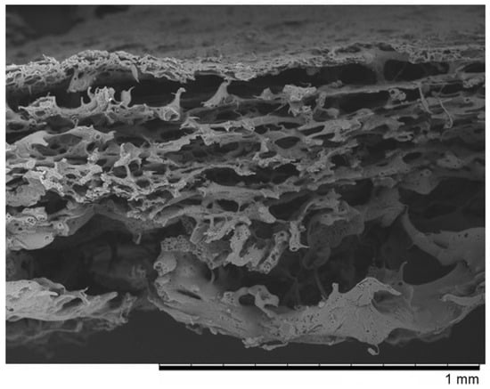 In the second case, the macropore precursor was a nonwoven fabric made of gelatin. We named it “Z” (Figure 2). It was obtained in a similar way to the previous membrane. The PLCA and PVP 10 kDa polymers with 4:1 ratio were dissolved in chloroform with constant stirring to obtain 10 wt.% concentration. The scaffold was made analogous to “PVP” preparation. The only difference was that the gelation bath contained cooled methanol at 4 °C and the obtained membrane was treated with warm water (50 °C) to removed gelatin nonwoven. Similarly to “PVP” membrane, scaffolds were stored in 70% ethanol. The gelatin nonwoven needs to be protected from water.