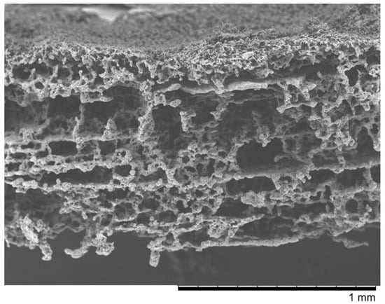 In the first case, the macropore precursor was a nonwoven fabric made of polyvinylpyrrolidone 1.3 MDa (PVP). We named it “PVP” (Figure 1). It was received as follows: the PLCA and Pluronic polymers with 4:1 were dissolved in dioxane with constant stirring to obtain 10 wt.% concentration. Next, a polymer mixture was poured onto the glass base and then the PVP nonwoven layer was laid. Then another portion of polymers was poured on the nonwoven and again a second slice of nonwoven and third layer of membrane forming solution were added. All layers were pressed and the air was removed using a Teflon roller. The received membrane was gelled in a bath with deionized water with ice (about 4 °C). The prepared membranes were stored in 70% ethanol. It is important to protect the PVP nonwoven from water to prevent its dissolving.