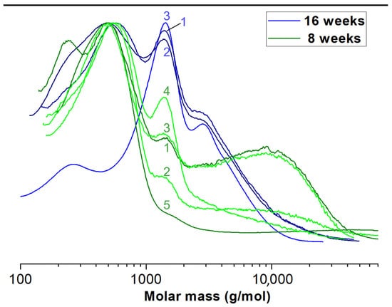 The weight average (Mw) and number average (Mn) of molar masses of the initial PCLA copolymer introduced to the membranes were 138,200 g/mol and 78,100 g/mol, respectively. We examined the copolymer material extracted after 8 and 16 weeks of implantation from 16 rabbit joints in total. The average molar masses were measured by means of GPC and calculated with respect to PS standards for all samples. Each sample contained several populations of macromolecules present at fractions. Since the molar mass distributions partially overlapped to facilitate statistical analysis, we decided to calculate the mean values for Mw and Mn for whole multimodal macromolecular distribution of all materials from each sample separately (Table 1). Exemplary, selected molar mass distributions are shown for illustration in Figure 5. Finally, we calculated the mean values of Mw for each type of membrane and implantation period. The data with standard deviation bars are presented in Figure 6.