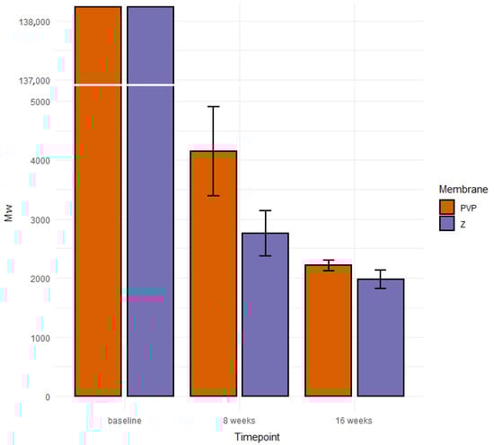 The GPC test was performed for 5 samples with “PVP” and 5 samples “Z” membrane 8 weeks after implantation; 3 samples with “PVP” and 3 samples “Z” membrane 16 weeks after implantation.