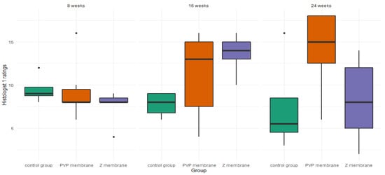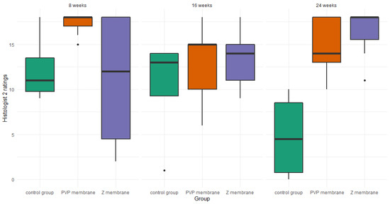 For histologist 2, there were no differences at the 8-week mark—H(1) = 1.96, p = 0.150, ε2 = 0.23 or the 16-week mark—H(1) = 1.04, p = 0.623, ε2 = 0.06. However, the Kruskal–Wallis test was significant at the 24-week mark—H(1) = 9.46, p = 0.004, ε2 = 0.56. Post-hoc tests for the 24-week mark revealed that histologist 2 rated the healing stage of the membrane PVP—Z = 2.48, p = 0.027, and the membrane Z—Z = 2.98, p = 0.009, as superior to the healing properties without a membrane. At the same time there were no differences between the healing properties of the membrane PVP and the membrane Z—Z = 0.59, p = 0.552 (Figure 8).