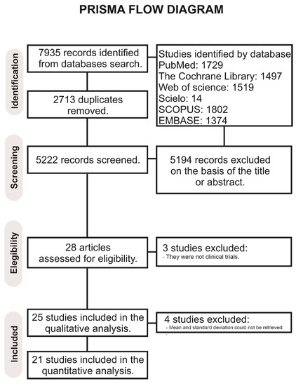 The search resulted in the retrieval of 7935 records (Figure 1). After removal of duplicates, 5222 articles were screened, and 5194 were excluded based on the eligibility criteria. A total of 28 full-text articles were assessed for eligibility. Of these, 3 were not considered for the qualitative analysis because they were not clinical trials, and 25 articles were included in the qualitative analysis [1,2,3,6,7,8,9,10,11,12,15,16,17,18,19,20,21,22,23,24,25,26,27,28,29]. Of these, four studies [6,25,26,29] were excluded from the meta-analysis because the mean and standard deviation could not be retrieved. Finally, 21 studies were considered for the meta-analysis.