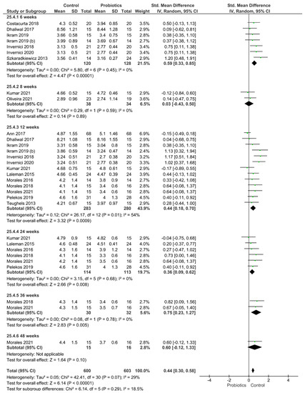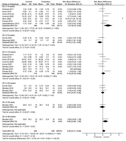 Meta-analyses were performed using Review Manager Software version 5.3.5 (The Nordic Cochrane Centre, The Cochrane Collaboration, Copenhagen, Denmark). The analyses were carried out using the random-effects model, and pooled-effect estimates were obtained by comparing the standardized mean difference between the periodontal clinical parameters obtained from the control and experimental groups. Subgroups were built according to the follow-up time evaluated. A p-value <0.05 was considered statistically significant. Statistical heterogeneity of the treatment effect among studies was assessed using the Cochran Q test and the inconsistency I2 test.