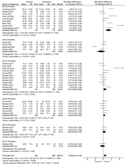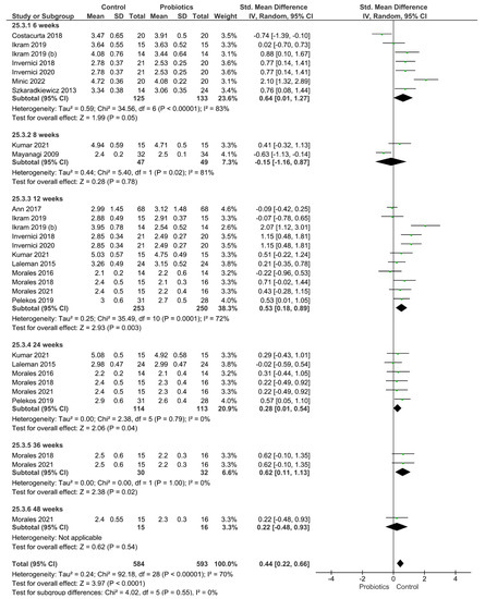 Regarding the clinical attachment loss parameter. Once again, the control group achieved statistically higher values of this parameter, meaning that the use of probiotics as adjuvant therapy resulted in an improvement of this parameter. The clinical attachment loss is a parameter used to assess the loss of periodontal tissue support in periodontitis [39]. In this sense, it is important to explain that pro-inflammatory cytokine response plays a significant role in the nonspecific response against bacterial and fungal pathogens, and this is considered a principal mediator of periodontal disease [40]. Some reports have explained that a decrease in the levels of TNF-a, IL-1b, and IL-17 in the periodontal pockets of patients with periodontitis is observed following the treatment with the probiotic strain of L Lactobacillus reuteri, which may carry clinical significance [41,42]. The decrease in the pro-inflammatory cytokine response in chronic periodontitis caused by the application of probiotics may explain the results obtained in this meta-analysis.