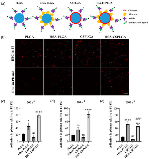 Figure 1. Adhesion of sLeA-targeted PLGA, HSA-PLGA, CSPLGA, and HSA-CSPLGA to an inflamed endothelial cell monolayer in vitro. (a) Schematic of ligand-targeted uncoated and coated PLGA. (b) Representative fluorescent images of rhodamine-loaded, sLeA-targeted particles bound to inflamed endothelial cells in RBC-in-FB and RBC-in-plasma conditions at 200 s−1. Particles with 1000 sites/µm2 of sLeA were added to RBC-in-FB or RBC-in-ACD plasma at a 5 × 105 particles/mL concentration and perfused over HUVEC activated for 4 h. Particles in plasma were incubated for 5 min prior to the experiment. Quantified adhesion of particles in RBC in plasma relative to RBC FB at 200, 500, and 1000 s−1 are shown in (ce). Statistical analysis was completed using one-way ANOVA with Dunnett’s multiple comparison test with PLGA as control. * = p < 0.05, *** = p < 0.001, **** = p < 0.0001, and ns = not significant. ### = p < 0.001 relative to binding at 200 s−1. n = 10 distinct donors. Error bars represent standard error. The scale bar is 100 µm. sLeA = sialyl Lewis A, HSA = human serum albumin, CS = chitosan, ACD = acid-citrate-dextrose, RBC = red blood cell, FB = flow buffer.