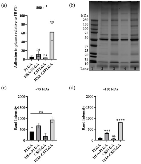 Figure 4. Adhesion and protein characterization of sLeA-coated PLGA, HSA-PLGA, CSPLGA, and HSA-CSPLGA in heparin plasma at 500 s−1. Particles with 1000 sites/µm2 of sLeA were incubated in RBC FB and RBC plasma at a 5 × 105 particles/mL concentration and perfused over HUVEC activated for 4 h. Particles in plasma were incubated for 5 min before the experiment. (a) Particle adhesion efficiency in heparin plasma. (b) SDS PAGE of particles exposed to heparin plasma. Lane 1: molecular weight ladder, Lane 2: PLGA, Lane 3: HSA-PLGA, Lane 4: CSPLGA, and Lane 5: HSA-CSPLGA. Each lane was analyzed with ImageJ. Plotted are isolated band intensities at ≈75 kDa (c) and ≈150 kDa (d). Statistical analysis was completed using one-way ANOVA with Dunnett’s multiple comparison test with PLGA as control: ** = p < 0.01, *** = p < 0.001, **** = p < 0.0001, and ns = not significant. n = 7 for (a) and n = 3 for (c,d) distinct donors. Error bars represent standard error.