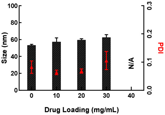 The influence of IP-DHA drug loading on the mean size of NE after the dilution of SNEDDS-IP-DHA in MilliQ water (dilution 1:1000). The columns represent the mean size (nm) and the red triangles the PDI. (n = 3).