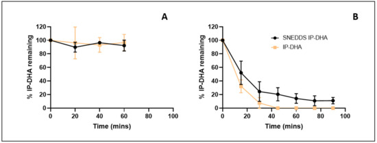 The stability of IP-DHA, SNEDDS, and SNEDDS-IP-DHA was studied in SGF and SIF media to evaluate the impact of pH and enzymes on the potential degradation of IP-DHA over time. In the gastric medium, with or without formulation, IP-DHA remained stable and was not degraded by a low pH or by pepsin in the medium (Figure 6A). Without formulation, the solubility of IP-DHA in the gastric medium was limited (7.39 ± 0.26 µg/mL). This solubility was increased when using the SNEDDS formulation (>225 µg/mL). In the intestinal environment, with and without formulation, a degradation of IP-DHA was observed (Figure 6B). This degradation was probably due to the presence of pancreatin in the environment. We presumed that pancreatin could cleave the ester function of IP-DHA. However, this degradation is limited when using SNEDDS (T1/2 SNEDDS-IP-DHA = 17 min vs. T1/2 IP-DHA = 11 min). Similar to SGF, the solubility of IP-DHA in the ISF (>225 µg/mL) was increased when using the SNEDDS formulation. These results were not surprising; it has been reported that SNEDDS may protect drugs from enzymatic degradation in the gastrointestinal tract [21]. Moreover, another study showed that nonionic surfactants provide protection against lipase destabilization in emulsions [49], which could explain the limitation of the degradation of IP-DHA with SNEDDS.