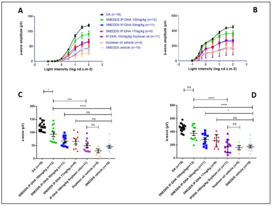 ERG analysis is used to determine the electrical activity of the retina. The results showed the amplitude of a- and b-waves at different light intensities (Figure 7A,B). The maximum of the a- and b-amplitudes with the vehicles IP-DHA and SNEDDS-IP-DHA are represented in Figure 7C,D. Dark-adapted (DA) mice that were not exposed to light were considered to have 100% photoreceptor activity (positive control). Mice that were force-fed the vehicles (soybean oil and SNEDDS) were not protected from light-induced degeneration, and lost 76 and 63% of their activity, respectively (DA vs. soybean oil/SNEDDS, (Figure 7C). IP-DHA solubilized in soybean oil and administered at 100 mg/kg did not show significant protection compared to the vehicle (42 vs. 24% for a-wave and 39 vs. 35% for b-wave). SNEDDS-IP-DHA showed a dose-dependent pattern of protection: SNEDDS-IP-DHA at 17 mg/kg seemed to protect slightly better than the vehicles, but there was no significant difference. At 50 mg/kg, we observed a slight degree of protection compared to the SNEDDS vehicle for the a-wave (55% vs. 37% of photoreceptors remaining, no significant difference) and for the b-wave (62% vs. 38% of photoreceptors remaining, significant difference). At 100 mg/kg, this protection increased for a- and b-wave, respectively, to 76 and 82%. It is interesting to notice that by an IV route in similar experimental conditions, a dispersed formulation of IP-DHA associated with BSA that was injected at 30 mg/kg produced a similar degree of protection (80–85%) [8].