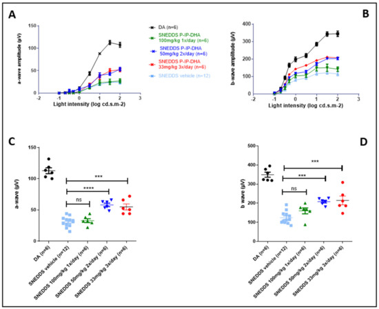 ERG results demonstrated that SNEDDS vehicles did not protect from blue light (≈1000 Lux), with 27% of photoreceptors remaining with SNEDDS compared to DA (100%). At a single daily dose of 100 mg/kg, SNEDDS-IP-DHA did not show an increase in any protective effect (29% of photoreceptors remaining). When maintaining the same daily dose but giving lower doses at shorter time intervals (2 × 50 mg/kg/day and 3 × 33 mg/kg/day), we observed a significant increase in the protection of photoreceptor activity. After the induction of degeneration with chronic light stress under low blue light intensities, 52% and 49% of photoreceptors remained, respectively (Figure 9).