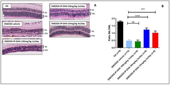 To complete the ERG evaluation, we conducted a histological study. Indeed, the histological analysis is considered to be an anatomical analysis. Thus, we used it to determine the thickness of the inner (INL) and outer (ONL) nuclear layers of the retina. The ONL layer contains the photoreceptors, and degeneration and cell death are indicated by a decrease in the thickness of the ONL layer. The INL/ONL ratio was then measured with histological analysis. We have shown that SNEDDS-IP-DHA at 100 mg/kg effectively protected the activity of photoreceptors in ABCA4KO mice. With this histological analysis, we wanted to evaluate the structure of the ONL and INL layers. The results were similar to those observed with the ERG analysis (Figure 8). DA mice showed an INL/ONL ratio of 2.2: the ONL layer was approximately two-fold thicker than the INL layer in untreated mice. Vehicles (soybean oil and SNEDDS) and IP-DHA solubilized in soybean oil at 100 mg/kg did not show any protective effects, and presented with INL/ONL ratios of 0.6; 0.7, and 0.7, respectively. We found a similar dose-response effect with SNEDDS-IP-DHA-treated mice with ERG analysis: a slight improvement in the preservation of the thickness of the ONL layer in mice treated with 17 and 50 mg/kg, but no significant difference being observed with the vehicles. The protective effect was observed at a dose of 100 mg/kg with SNEDDS-IP-DHA (INL/ONL ratio: 1.6); i.e., a conservation of layer thickness of 73%. This protection was slightly lower than those obtained via an IV route at a lower dose of 30 mg/kg [8].