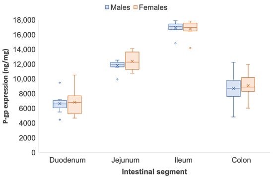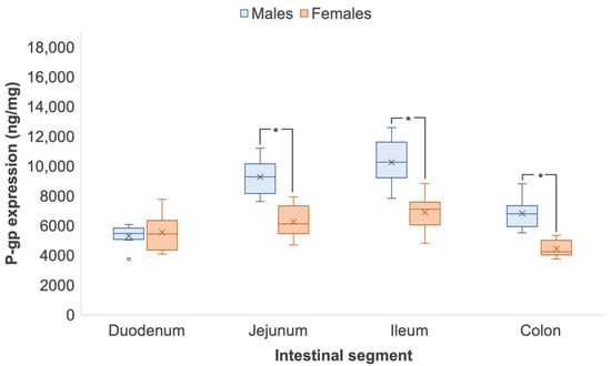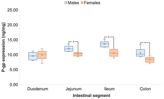Regional and sex differences in P-gp expression in male and female Wistar rats quantified by LC-MS/MS. Data are represented as mean ± S.D., n = 8. The * symbol denotes statistical significance between the sexes in an intestinal region (p < 0.05). Regional differences are statistically significant from the small intestinal segments to the colon (p < 0.05).