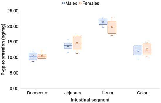 Regional and sex differences in P-gp expression in male and female Wistar rats quantified by ELISA. Data are represented as mean ± S.D., n = 8. The * symbol denotes statistical significance between the sexes in an intestinal region (p < 0.05). Regional differences are statistically significant from the small intestinal segments to the colon (p < 0.05).