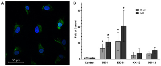 As shown in the fluorescence microscopy imaging (Figure 3A), FITC-KK-11 (Table 2) was present in the cytoplasm of A375 melanoma cells after 30 min incubation at 0.5 µM concentration. The uptakes of FITC-labeled KK-11 and three other peptides (KK-1, KK-12, and KK-13) were further confirmed using flow cytometry analysis (Figure 3B). Among the four tested peptides, the uptake of KK-11 by melanoma cells was observed to be the highest, and in a dose-dependent manner. At 1 µM concentration, the average fluorescence intensity was increased to more than 20-fold of FITC alone (control). KK-1 peptide also showed significantly increased uptake in melanoma cells, but to a lesser extent compared to KK-11 at the same concentration.