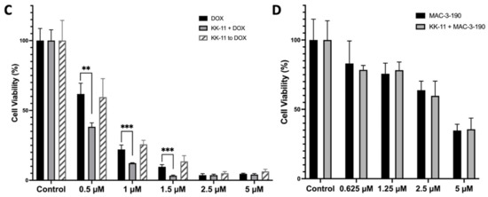 We further determined whether KK-11 enhances the drug delivery of cytotoxic DOX and nNOS inhibitor MAC-3-190 in vitro. Human melanoma A375 cells were then incubated with DOX in the presence or absence of KK-11. As shown in Figure 3C, DOX (0.5 µM) alone reduced cell viability to 62% of control. Co-treatment with KK-11 (1 µM) significantly enhanced the cytotoxicity of DOX and decreased cell viability to 40% of control (p < 0.001). At 1 µM, DOX in combination with KK-11 reduced cell viability to 14% of control cells, while 24% of melanoma cells survived from DOX treatment alone. Of note, treatment of melanoma cells with KK-11 and DOX sequentially failed to produce any changes on DOX cytotoxicity in melanoma cells.