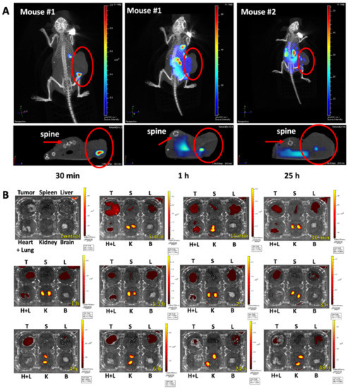 The study was carried out in compliance with Animal Research: Reporting of In Vivo Experiments (ARRIVE) guidelines. All the animal procedures were approved by the Institutional Animal Care and Use Committee (IACUC) at Chapman University and conducted in compliance with the policies of Chapman University, in addition to those of federal, state, and local animal welfare authorities. Male and female athymic nude mice (4–6 weeks old) were kept (5 in each cage) in a pathogen-free environment. Approximately 1 million human melanoma A375 cells (0.1 mL in normal saline), mixed with 0.1 mL cold Matrigel (#354248; Corning, Corning, NY, USA), were injected subcutaneously into the flank. The tumor size was measured with a caliper, and body weight was recorded once a week. When the tumor size reached approximately 800–1000 mm3, as calculated using the following formula: [Length × (Width2)]/2 (in mm) [8], mice were processed for in vivo or ex vivo imaging [26].