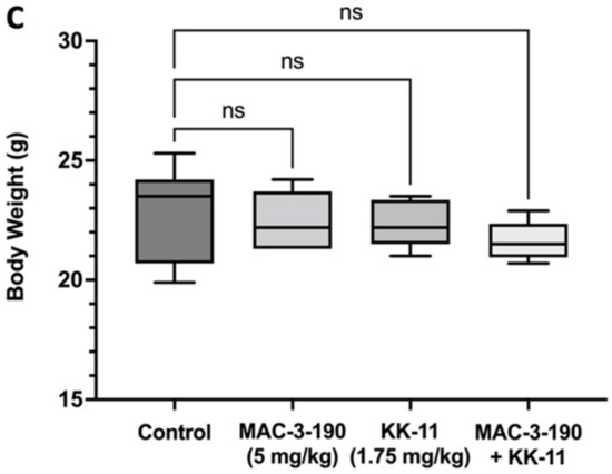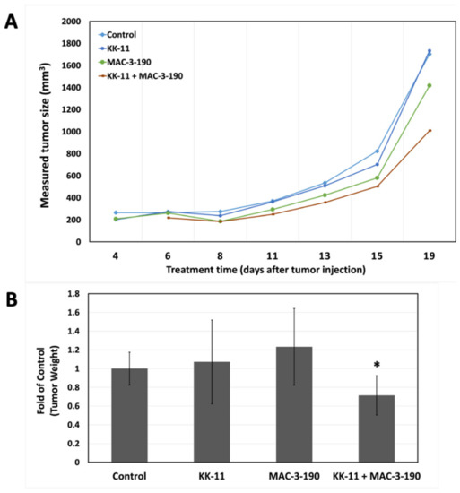 In vitro, we did not observe any significant difference in cytotoxicity between MAC-3-190 and co-administration of KK-11 and MAC-3-190 (Figure 3D). In addition, our previous studies and preliminary observations demonstrated that MAC-3-190 (5 mg/kg/day) does not have any significant antitumor activity in vivo [8]. Therefore, we evaluated if co-administration with KK-11 peptide would affect the antitumor activity of MAC-3-190 in vivo in mice carrying melanoma xenografts. Using an A375 melanoma xenograft mouse model, we compared the antitumor activity between mice injected with MAC-3-190 (5 mg/kg) and mice injected with a mixture of D-aa KK-11/MAC-3-190. Mice were also injected with saline or D-aa KK-11 to serve as controls. As shown in Figure 5A, co-administration of D-aa KK-11 with MAC-3-190 (1:11 molar ratio) exhibited significant inhibitory effects after 21-day treatment on tumor growth compared to the MAC-3-190 (5 mg/kg) and control groups. Co-treatment reduced tumor growth by 28.6% (p < 0.05; Figure 5B) without remarkable systemic toxicity occurring as indicated by the body weight at the end of 21 days of treatment (Figure 5C). MAC-3-190 was used in excess, as peptide can deliver higher concentrations of the drug to the cancer site with a higher drug-to-peptide ratio (DPR). For similar reasons, a peptide-drug conjugate, ANG1005 with a PDR of 3, is currently in clinical trials for paclitaxel delivery [34]. Also, the approved ADCs typically have a drug-to-antibody ratio (DAR) of 3–8 [16].