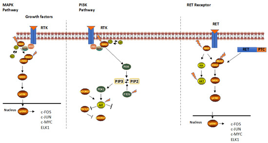 - Santoro, M.; Dathan, N.A.; Berlingieri, M.T.; Bongarzone, I.; Paulin, C.; Grieco, M.; Pierotti, M.A.; Vecchio, G.; Fusco, A. Molecular characterization of RET/PTC3; a novel rearranged version of the RETproto-oncogene in a human thyroid papillary carcinoma. Oncogene 1994, 9, 509–516. [Google Scholar]