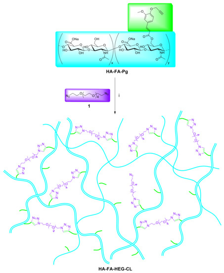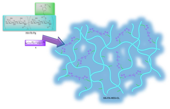 With the aim of further extending the application of HA-FA-Pg graft copolymers to the development of new materials based on two natural compounds from biorenewable resources, we developed a cross-linking procedure in which the propargyl groups of HA-FA-Pg derivatives showing different molar mass and grafting degree values were exploited in the CuAAC coupling with a hexa(ethylene glycol) derivative terminated with azide groups at both ends (compound 1, azido-HEG-azido) to obtain cross-linked HA derivatives (i.e., HA-FA-HEG-CL) (Figure 2).