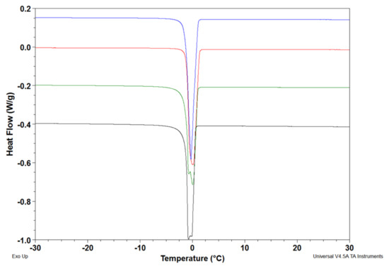DSC thermograms of frozen hydrogels and of bidistilled water (from which the latent heat ΔH was obtained) permit quantifying latent heat ΔH of the freezing water (ΔHm). The freezing water (WfH) was derived using Equation (4):