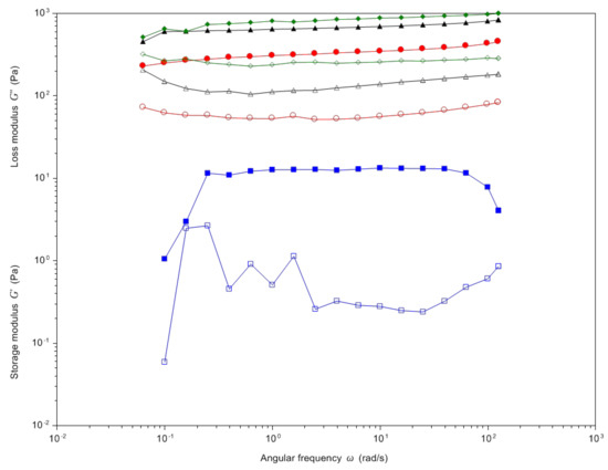 Elastic (G′) and viscous (G″) moduli of samples (shear strain: 0.25%) were measured as a function of oscillation frequency in the range of 0.1–10 Hz using a plate–plate geometry (Ø = 4 cm).