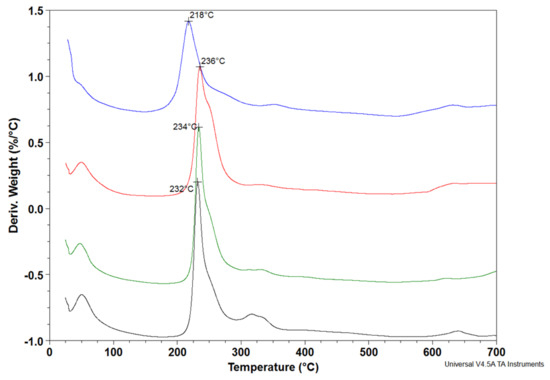 Thermographs obtained plotting the derivative of weight versus temperature (30–600 °C) of the hydrogels obtained with HA(270)-FA-HEG-CL-20 (green), HA(270)-FA-HEG-CL-40 (black), HA(270)-FA-HEG-CL-10 (red), and HA(8.7)-FA-HEG-CL-20 (blue).
