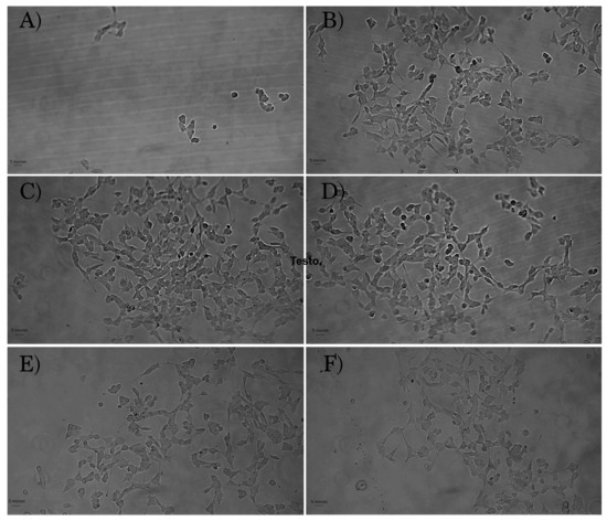 Optical microscope images of NIH3T3 mouse fibroblasts after 24 h of contact with: (A) positive control; (B) negative control (LDPE); (C) HA(270)-FA-HEG-CL-10; (D) HA(270)-FA-HEG-CL-20; (E) HA(270)-FA-HEG-CL-40; (F) HA(8.7)-FA-HEG-CL-20. Databar 5 µm. Magnification: 20×.
