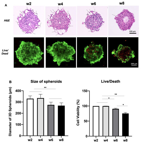 Changes in sizes and cell viability of 3D USC spheroids at different time points. (A) The sizes of spheroids remained stable at weeks 2 and 4 but decreased after 6 weeks. Renal tubular-like structures (arrows) formed and appeared at the optical layer of the spheroids. Most cells (95%) survived at 4 weeks, whereas about 10–20% of cells were dead (red) at 6 weeks. The initial seeding cell number is 4 × 103 per well in 96 wells, assessed by H&E staining and live/dead kit on the tissue sections. (B) Quantification of size and cell viability of 3D spheroid as shown in (A). * p < 0.05; ** p < 0.01.