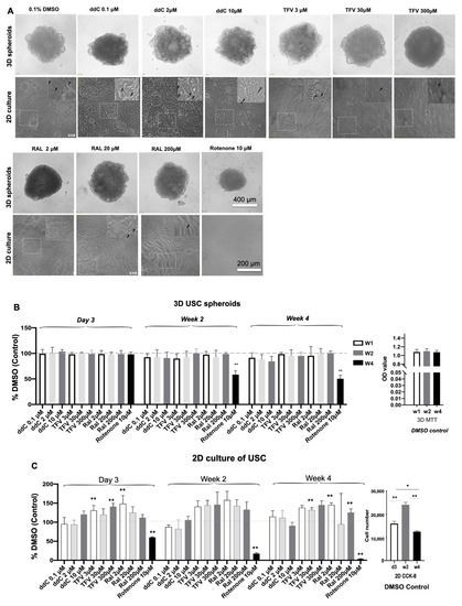 Changes in cell morphology, growth, and viability of 3D spheroids of USC 4 weeks after exposed to antiretroviral drugs. (A) Sizes of spheroids remained stable 4 weeks after ddC, TFV, RAL at different doses (low, medium, and high doses), which were similar to those in DMSO control, but significantly declined in the spheroid treated with RTNN, by phase contrast microscope (whole mount view) The vacuoles (dark short arrows) and cell lysis (dark long arrows) appeared in the cytoplasm of USC treated with ddC in 2D culture. Selected areas enlarged in inserts at the upright corner. (B) Numbers of USC remained stable with no cell proliferation in 3D culture in an ULA 81 well, by MTT assay. (C) Cell proliferation of USC in 2D culture in regular 96-wells, assayed by CCK-8. (D) Cell viability of USC in 3D spheroids, assessed with Live/dead staining, using confocal microscopy. USC at p4 were cultured at ULA 96 well. (8 × 103 cells/well, USC at p4). * p < 0.05; ** p < 0.01.