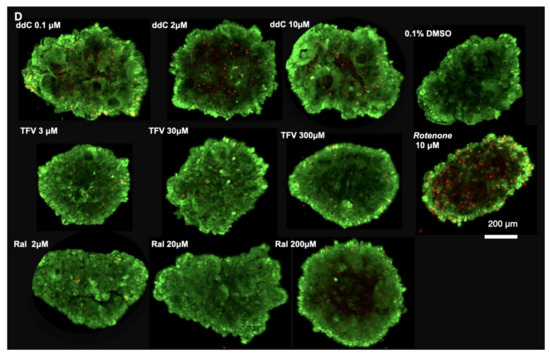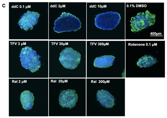 We dosed the spheroids every other day for up to 4 weeks, but it takes several years clinically for delayed Mito-Tox to manifest itself. Since ddC and RAL are typically dosed twice daily and TFV once daily, a patient would receive hundreds of doses of drugs before Mito-Tox is observed as compared to the maximal number 15 doses given in this experiment. Therefore, multiple doses around and above clinically achievable plasma levels (see Materials and Methods) were used.