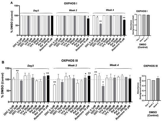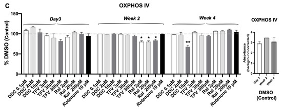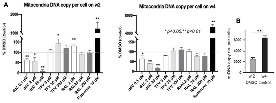 Quantitative real-time PCR analysis showed that ddC resulted in a dose- and time-dependent significant reduction of mtDNA (versus nuclear DNA) content, another marker of Mito-Tox (Figure 5). TFV at 30 µM and RAL at 2 µM significantly increased mtDNA content (p < 0.05) at 2 weeks. In contrast, the new agent RAL at the medium dose of 20 µM significantly reduced mtDNA content (p < 0.05) at 4 weeks (Figure 5A). However, mtDNA remained unchanged with TFV treatment, which is similar to that previously reported [51]. In addition, excessive mtDNA damage induced by RTNN displayed a compensatory increase in mtDNA content (i.e., mtDNA biogenesis) as has been noted in 2D culture [52]. mtDNA content significantly increased from week 2 to week 4 in 0.1% DMSO control treated USC in 3D spheroids (p < 0.01). (Figure 5B).