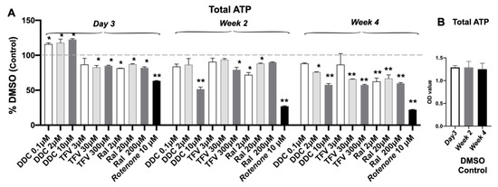 As expected, RTNN significantly reduced ATP levels at day 3, week 2 and week 4 (38%; 66.4%; 27.4%, p < 0.01) respectively, assessed by colorimetric assays (Figure 4A). Significant increases in total ATP occurred 3 days after ddC treatment; while significant decreases in total ATP were observed in USC following treatment with all three ARTs: ddC at the high dose at week 2 and at all 3 doses at week 4; TFV at the middle or high doses at weeks 2 and 4; the newer drug RAL at all 3 doses at weeks 2 and 4. These drugs also resulted in a dose- and time-dependent reduction in total ATP from 2 to 4 weeks, indicating a delayed dose-dependent Mito-Tox. Total ATP levels remained consistent in DMSO control (Figure 4B).