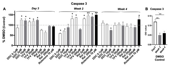 The caspase 3 assay measured the activity of the enzyme in cell lysates by its ability to recognize and cleave the peptide substrate DEVD-p-NA. The cell lysates (1000 µg/mL per well) were incubated with the substrate DEVD-p-NA in a 96-well assay plate for 24 h. Wherein the substrate was cleaved by caspase 3 enzyme releasing the chromophore p-nitroaniline (p-NA), which was quantitated by measuring absorbance at 405 nm on a Spectramax 190 (Molecular Devices LLC, San Jose, CA, USA) plate reader. The % caspase 3 level of the lysates was calculated as described below: % caspase 3 level = 100 × OD 405nm measured in cell lysate for each concentration of test article collected at specific incubation time (day 3, week 2 or week 4)/OD 405 nm measured for the respective DMSO control collected at the same incubation time.