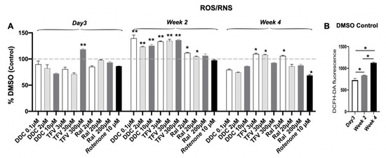 Fluorescent measurements showed that total ROS/RNS levels were significantly increased in ddC-TFV and RAL-treated UCS 3D spheroids at week 2 (p < 0.05), and low and mid-dose TFV and low dose RAL increased ROS/RNS but did not increase in ddC, TFV and RAL at high doses at week 4, as compared to DMSO control (Figure 7A). Interestingly, basal (DMSO control) levels of ROS/RNS increased with culture time, especially at 4 weeks, potentially explaining the relative lack of drug effects at this time point (Figure 7B). Finally, glutathione, a major intracellular antioxidant, was unchanged in 3D USC spheroids after any single ART drug treatment and time (Supplementary Figure S1). This is presented in both reduced (glutathione) and oxidized (glutathione disulfide [GSSG]) forms (Supplementary Figure S1).
