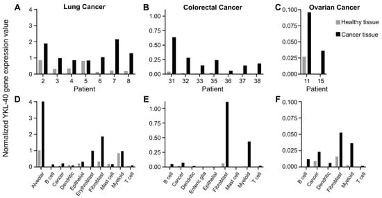 Public scRNAseq data were used to investigate which cell type(s) is responsible for the elevated YKL-40 expression found in cancer tissues from patients with early-stage lung cancer, mixed-stage colorectal cancer, and ovarian cancer. For all patients, YKL-40 gene expression was higher in biopsies from cancer tissue compared to adjacent, matched healthy tissue (Figure 1A–C). There was, in general, low or no detectable YKL-40 expression in the healthy tissue. YKL-40 gene expression was higher in patients with lung cancer compared to colorectal cancer (Figure 1A,B). Low expression values were observed for ovarian cancer (Figure 1C). YKL-40 gene expression was primarily increased in the fibroblast (gene annotation: COL1A, BGN, DCN), myeloid (gene annotation: CD68, LYZ, AIF1), cancer (gene annotation: EPCAM, KRT7, KRT18), and B-cell (gene annotation: CD79A, CD79B) populations in cancer tissue compared to healthy tissue (Figure 1D–F). Specifically for lung cancer, the highest expression level was observed in the alveolar (gene annotation: CLDN18, SFTPA1, SFTPA2, SFTPC) cell population, and erythroblasts (gene annotation not available) also increased their expression (Figure 1D).