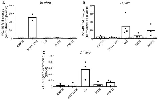 We investigated YKL-40 expression in cultured cell lines and in engrafted tumors derived from five common mouse cancer cell lines of different cancer types originating from the C57BL/6 mouse strain. YKL-40 was detected in cultured EO771.LMB and MC38, but not in cultured B16F10, LL2, and PANO2. The highest expression of YKL-40 was found in LL2 tumors, whereas B16F10 and EO771.LMB had the lowest expression, and YKL-40 was only detected in 1 out of 3 tumors after RNA sequencing. Others have shown a similar absence in cultured human cancer cell lines and an up-regulation of YKL-40 in xenograft tumors []. One explanation for this could be that YKL-40 is mainly expressed by other cells than cancer cells, as also indicated by our analysis of scRNAseq data and immunohistochemistry. Another explanation could involve the different environments that cells experience in vivo compared to in vitro, which could stimulate upregulation of YKL-40 in cancer cells. An elucidation of YKL-40 expression is important for model selection in future studies investigating the role of YKL-40 in cancer. Overall, our data show that YKL-40 expression in cultured cancer cells does not necessarily reflect the expression levels in the formed tumors, as observed by others [].