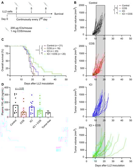 LL2 was selected for investigation of COS as monotherapy or in combination with ICIs due to the highest YKL-40 gene expression among the tumor models. Mice subcutaneously inoculated with LL2 cancer cells were treated with COS or an ICI cocktail consisting of anti-PD-L1 and anti-CTLA-4 antibodies (Figure 3A). COS alone did not affect the tumor growth or survival of the mice (Figure 3B,C). Treatment with ICIs resulted in reduced tumor growth in individual mice (Figure 3B) and prolonged survival compared to control mice (Figure 3C). Strikingly, the combination of COS and ICIs led to delayed tumor growth and prolonged survival compared to the single treatments (Figure 3B,C). A trend towards lower plasma YKL-40 in the treatment groups that received COS was observed. These levels were comparable to plasma YKL-40 levels in tumor-free C57BL/6 mice (Figure 3D).