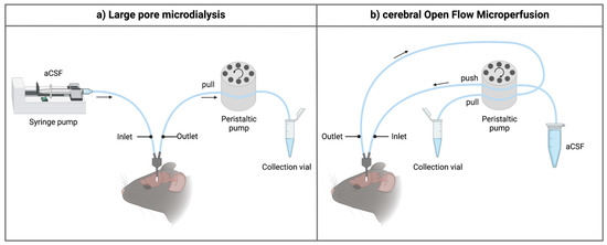 Schematic overview of the inlet and outlet tubings for the sampling techniques. (a) When using high-molecular-weight-cut-off microdialysis probes, a push-pull system is required to prevent loss of perfusion fluid through the large pores of the membrane. The setup generally contains a separate controlled pulse-free syringe pump and a peristaltic pull pump (e.g., using an AtmosLM™ or CMA ultra-high cut-off probe). For classical microdialysis, a pull pump is not used. (b) For the cerebral open flow microperfusion probe, a peristaltic push-pull microperfusion pump (MPP102 PC, Basi) can be used. Hereby, inflow and outflow can be controlled via the same pump head. Figure created with BioRender.com accessed on 6 April 2022. aCSF: artificial cerebrospinal fluid.