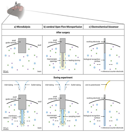 All three techniques are commonly referred to as being minimally invasive, although it is clear that the surgical implantation of the probe/electrode has its consequences [72]. Therefore, a recovery and equilibration period should be considered prior to starting the experiments. The literature is not conclusive regarding the integrity of the BBB [41,73,74,75,76,77,78,79,80]. Moreover, manuals available with the different commercialized microdialysis probes do not even provide information about this.