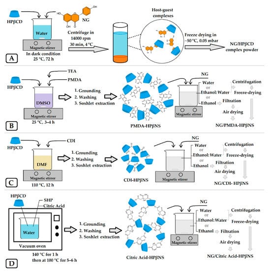 In next step, three different types of nanosponges were loaded with NG via three different solvents as presented in the scheme in Figure 1B–D. Two types of NG-loaded HPβNS were prepared by the following freeze-drying method [31]: NG (10 mg/mL) was added to a suspension of each HPβNS (5 mg/mL) in two different solvents, i.e., pure water and water/ethanol (50% v/v), under magnetic stirring for 48 h in the darkness at room temperature (1:2 w/w HPβNS:NG). The supernatant was separated through centrifugation at 4500 rpm for 30 min and was lyophilized using Telstar lyophilizer at −50 °C and operating pressure of 0.05 mbar for use in subsequent experiments.